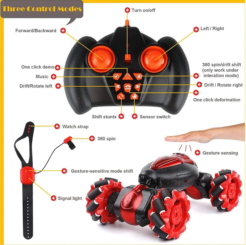 Mode de télécommande intelligent : la télécommande adopte la technologie de transmission 2,4 GHz, qui est sensible au contrôle et au contrôle à très longue distance. Et encore une autre montre télécommandée étonnante. Portez la montre sur votre main, changez de posture et la voiture déformable peut détecter vos changements de posture, conduire et changer à volonté.